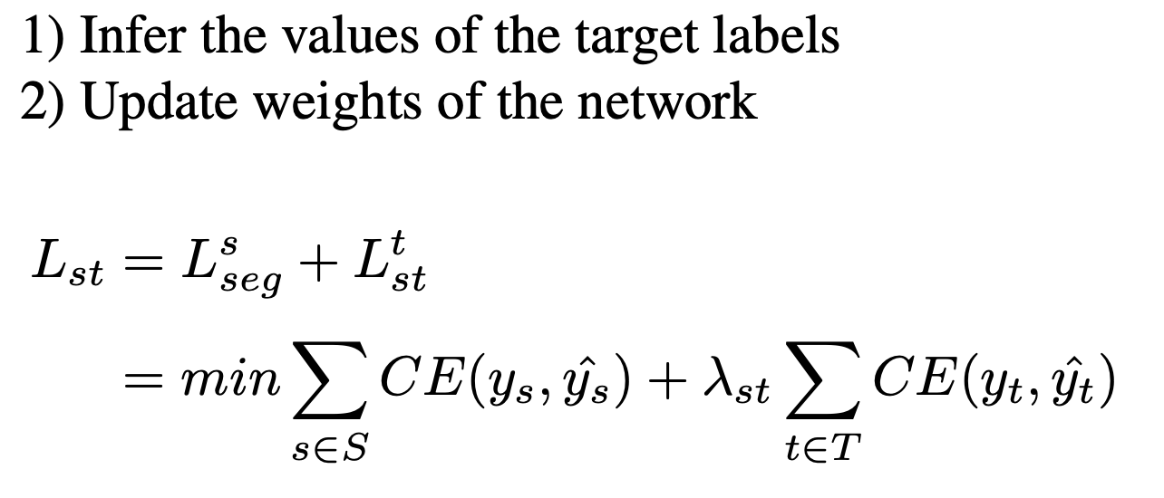 위 수식에서 $s$는 source domain, $t$는 target domain이 된다. 그리고 $y_s$는 source domain의 GT label, 그리고 $y_t$는 target domain의 pseudo label이 된다. 이를 GT삼아 CE(Cross Entropy)를 계산하게 된다.
