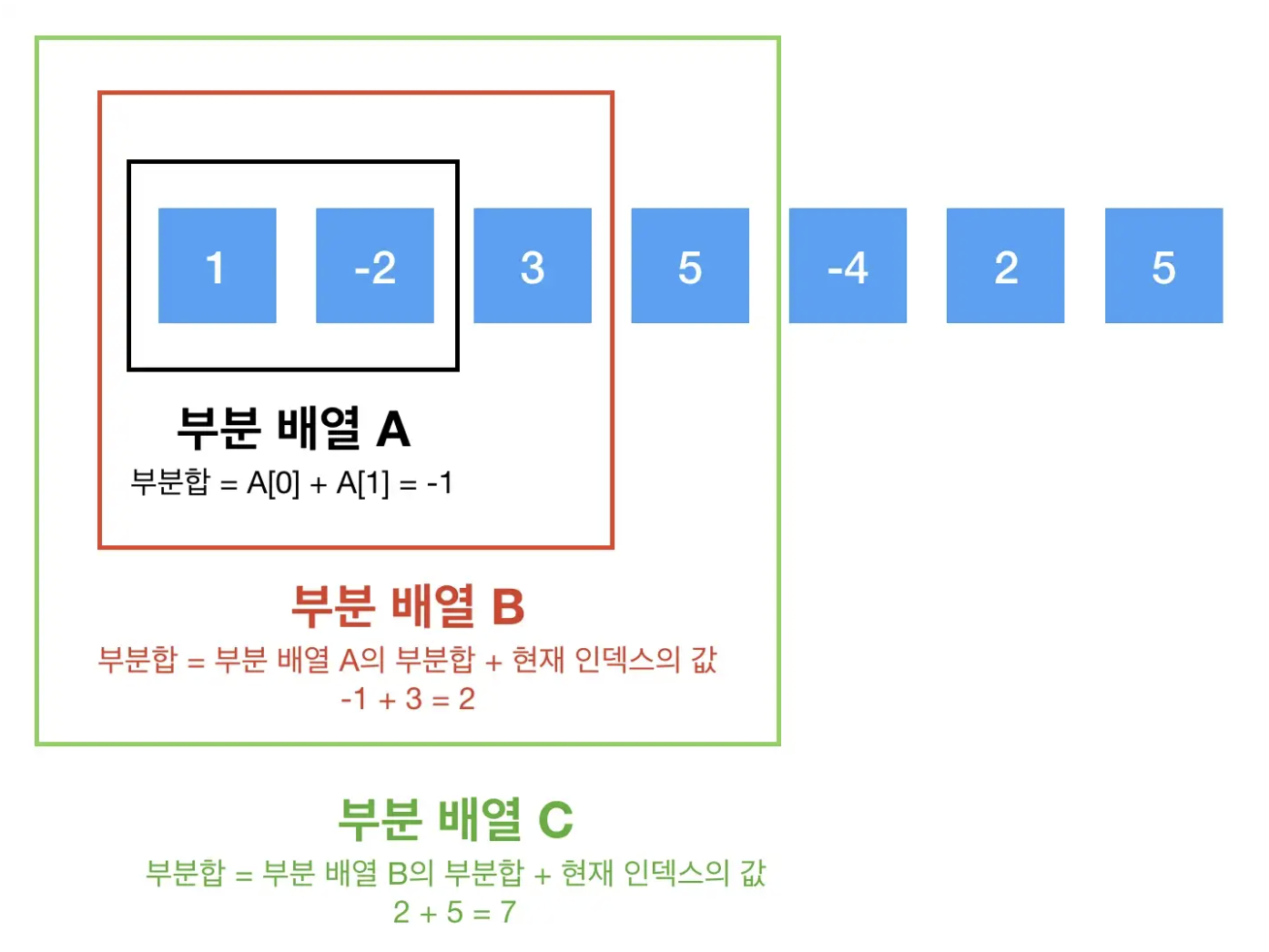 주어진 배열 A를 [1,-2,3,5,-4,2,5] 라고 했을 때