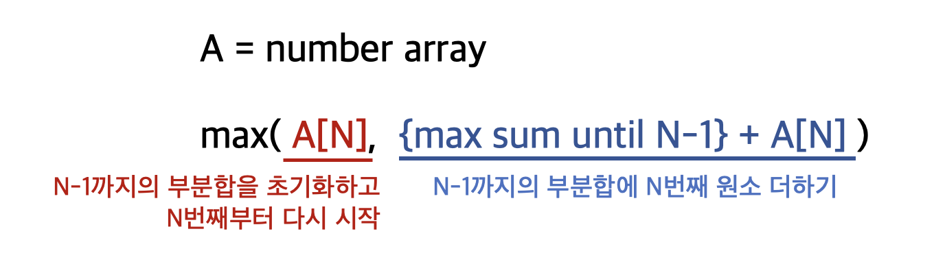 아이디어는, "N단계의 부분합은 N-1단계의 부분합이 반영된 결과라는 것" 이다. 즉, 순차적으로 부분합을 구해 N단계에서 이러한 부분합을 이용할 것인지, 이용하지 않고 초기화하고 다시 N단계 원소부터 새로 부분합을 쌓아갈 것인지를 DP 점화식이 판단하도록 하면 된다.