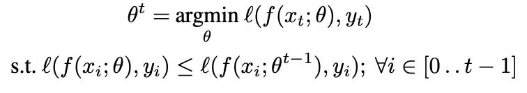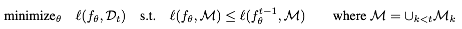 - GEM(Gradient Episodic Memory) : Task 별로 memory budget을 나누기 때문에 iid와 task boundaries가 필요함. 그리고 memory내 과거의 모든 task $k$에 대해 loss 계산이 필요하다. 이는 다음과 같이 나타낼 수 있다.