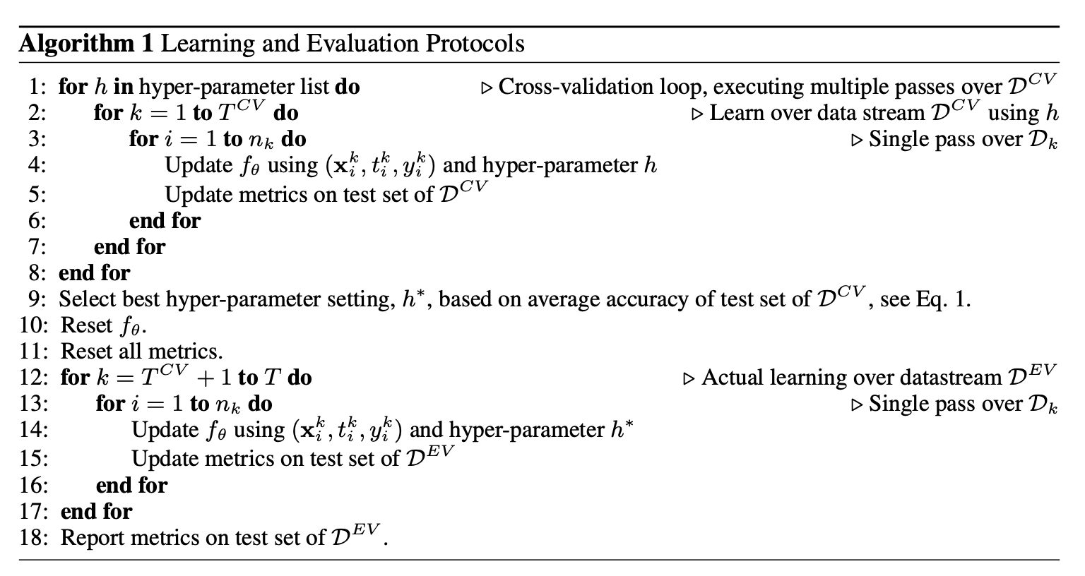 - 기존의 방법론처럼 single pass가 아니라, 데이터의 ordered sequences를 two streams로 나누어 학습한다. 먼저 $D^{CV}$는 model hypr-parameter selection을 위한 cross-validation용 데이터들이고(기존 CL 모델들은 초모수에 민감한 경우가 많았음), $D^{EV}$는 actual training/testing에 쓰이는 데이터셋이다.