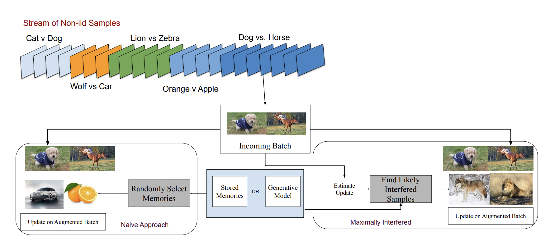 - 크게 (1) Replay Memory 에서의 방법과 (2) Generative Model 에서의 방법으로 나뉜다. Main idea는 과거의 샘플에서 랜덤하게 뽑지 말고, new incoming sample들에게 maximally interfered 되는 샘플을 Memory buffer $M$에서 뽑자는 것이다.