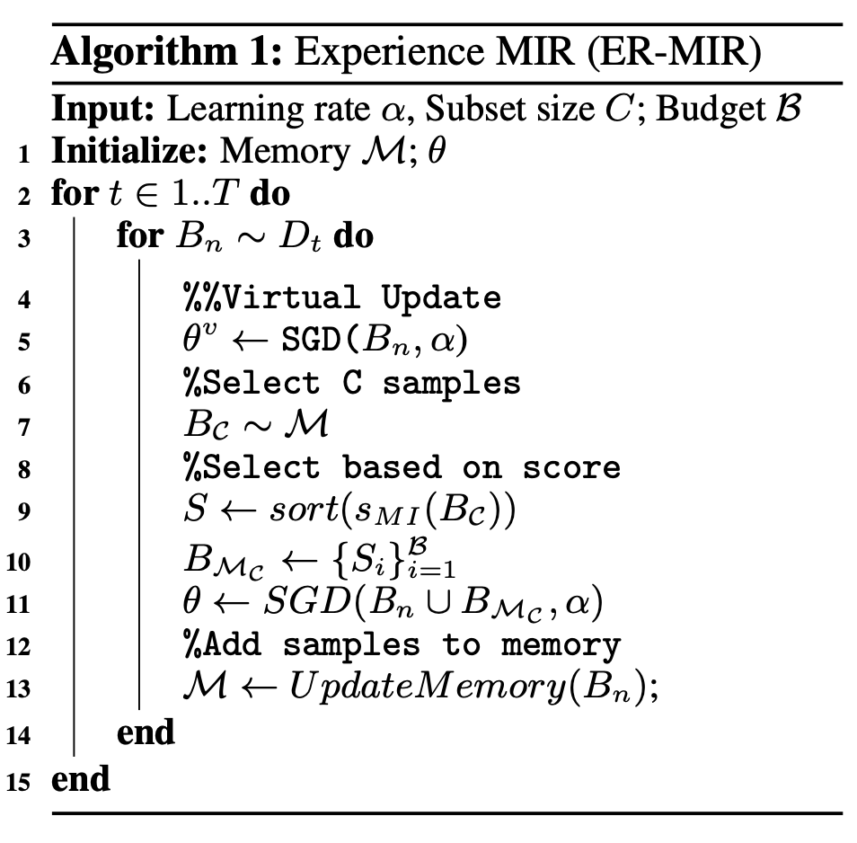 - 따라서 이 논문에서는 M(memory buffer)에서 랜덤하게 샘플을 추출하는 것이 아니라, loss를 증가시키는(=maximally interfered) samples를 추출해 사용해야한다고 주장한다.