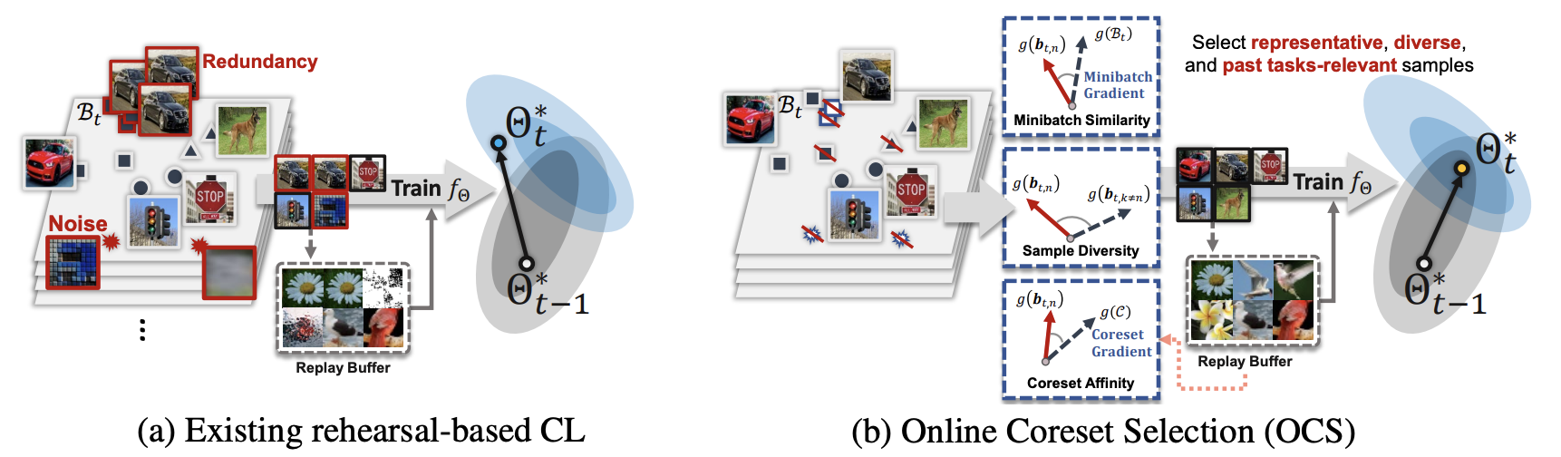 - 목표는 전체 데이터에서 training에 사용할 coreset을 고르자는 것이고, 이러한 과정을 통해 memory buffer 또한 coreset으로 구성되게 된다. (배치단위로 작동) 따라서 결과적으로 previous task에도 affinity하고, current task-adaptation에도 도움이 되는 것이 목표이다.