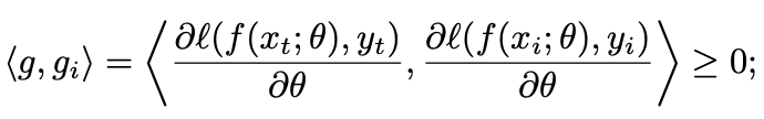 - 목표는 current examples의 loss를 과거의 학습된 examples의 loss를 증가시키지 않고 최적화 하는 것. 따라서 original constraints는 다음과 같고, 아래는 이 constraints를 gradient space에서 나타낸 것이다.