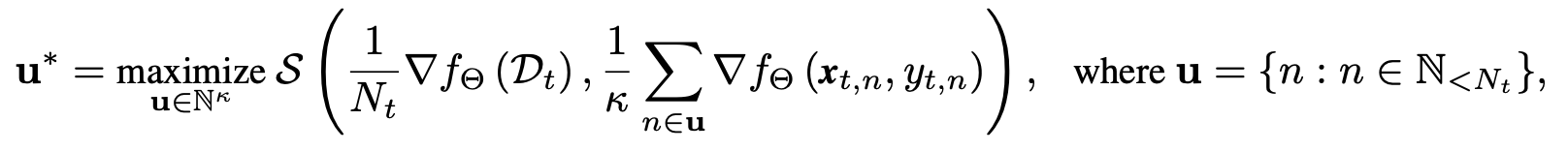 - 따라서 3가지의 selection criterion을 통해 gradient similarity를 maximize하는 방향의 coreset을 선정하는 것이 목표이다. 아래와 같이 공식으로 나타내진다.