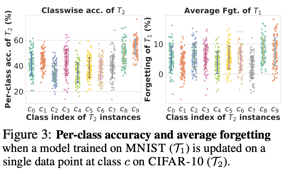 - Data point 하나하나가 CL 학습에 중요하다는 가설은 아래로 증명된다. Task 1 (MNIST에서 학습된 모델)을 Task 2 (CIFAR-10) 환경에서 single data point로 업데이트 할 때, per-class accuracy와 average forgetting 성능이 하나의 data point의 업데이트 만으로도 천차만별로 달라짐을 알 수 있다.