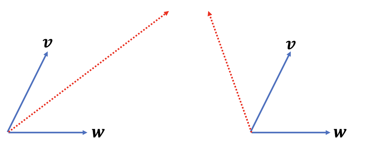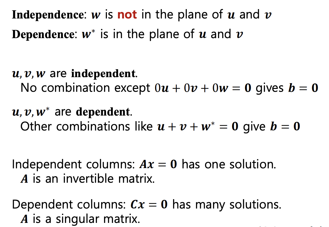 - 한마디로 정의하면, 만약 $u$와 $v$가 만드는 평면에 $w$ 벡터가 존재한다면 이 때 $u$, $v$, $w$는 dependent 관계이다. (우측 그림) 하지만 세개의 벡터가 존재하는 범위가 전혀 겹치지 않는다면, independent 관계라고 생각해보자.