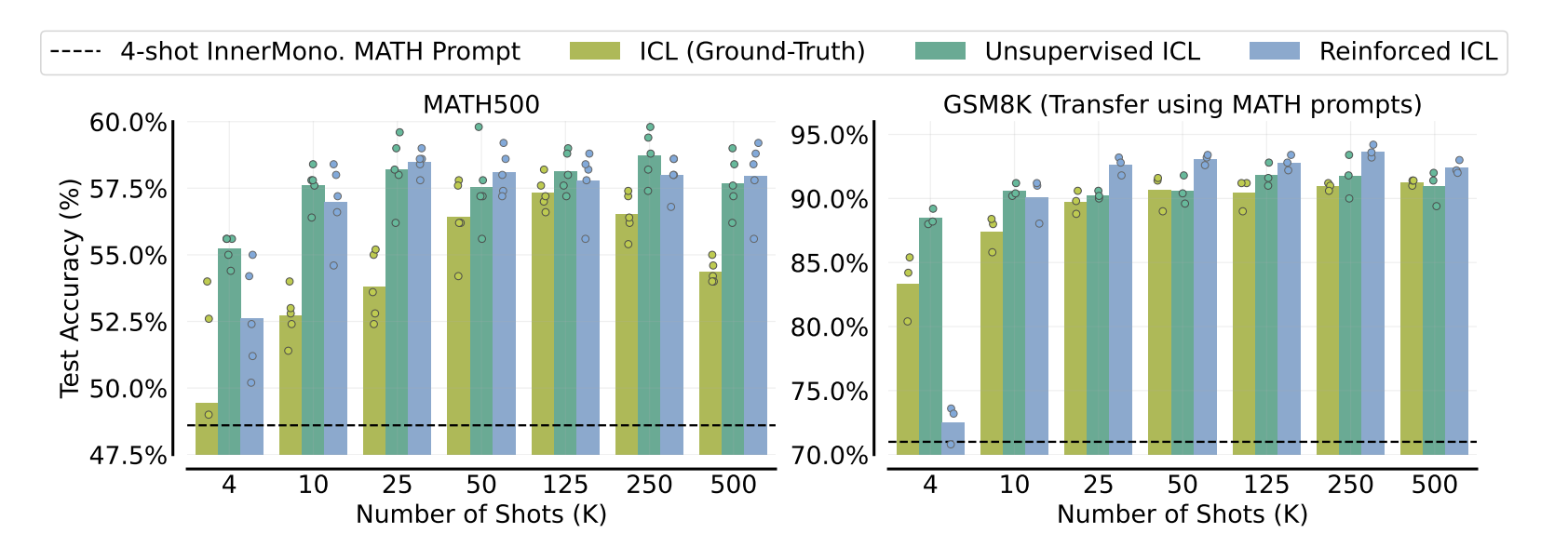 - Reinforced ICL: human-written solution을 model generated solution으로 대체할 수 있을까?