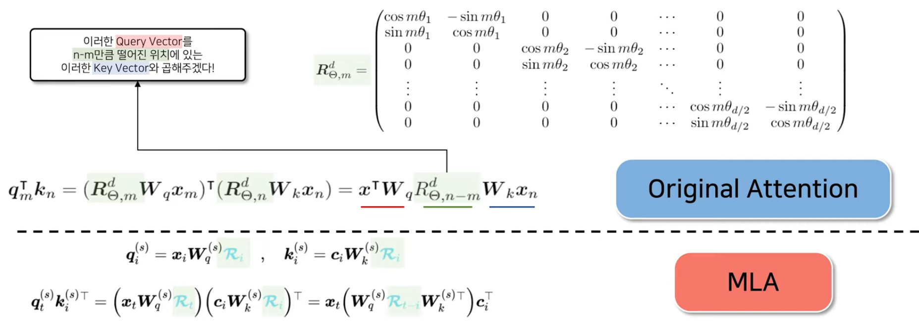 즉, RoPE는 단순한 위치 벡터를 더하는 방식이 아니라, Query와 Key를 각각 회전 행렬로 변환하여 위치 정보를 포함하게 만든다.