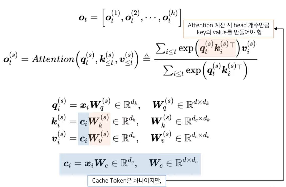 - Cache vector: 하나의 attn block 당 하나만 저장됨. (Multi-head 속성은 W_q에 흡수)