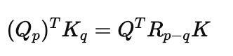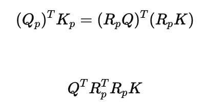 p과 q가 토큰의 index라고 할 때, 회전행렬 R을 같은 위치 p인 Query, Key에 적용하면 아래와 같이 원래 Q, K 내적이 유지된다. (R_p들의 내적이 사라짐)