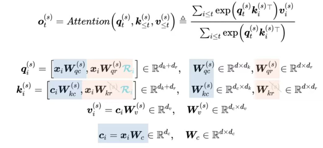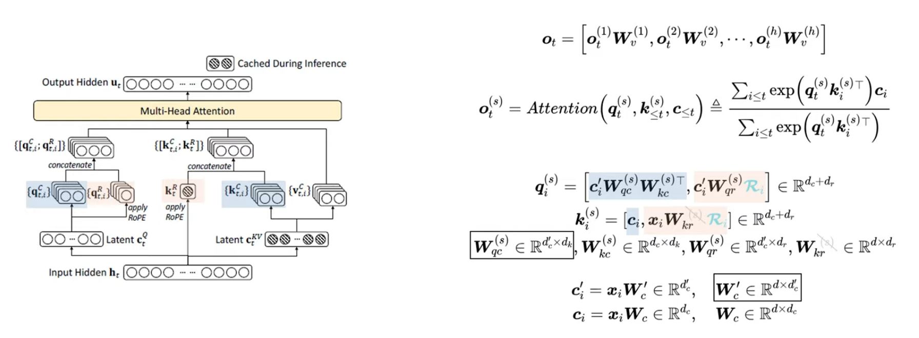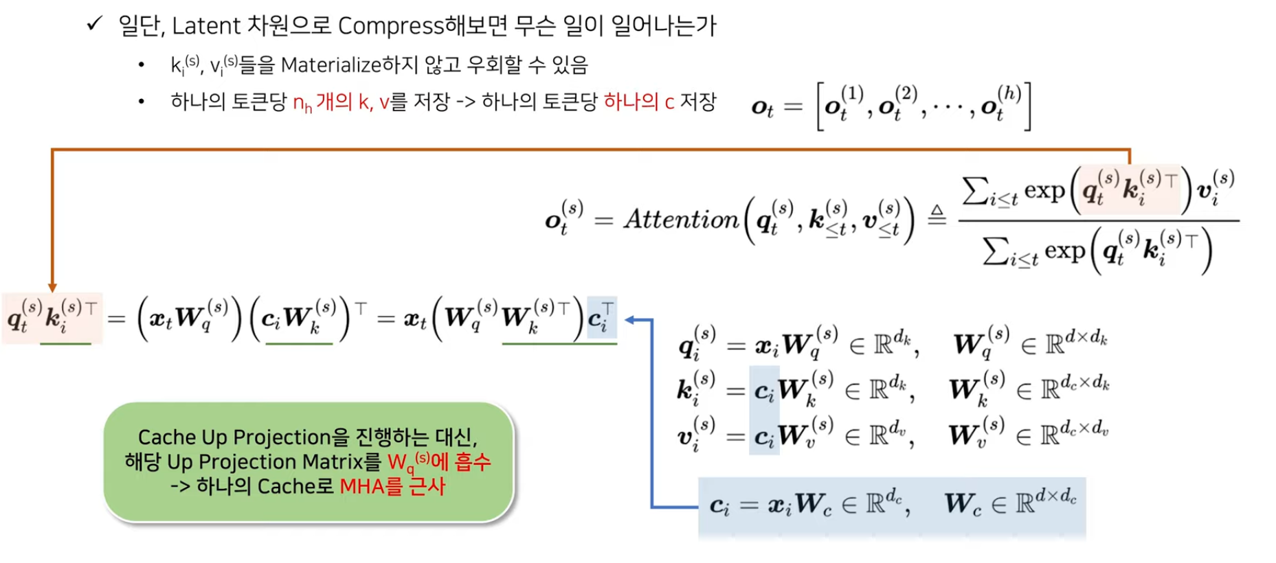 따라서 이 upprojection 과정을 방지한 구조가 Multi-head Latent Attention이다. 따라서 cache up projection 대신, 해당 upprojection matrix를 W_q^(s)에 흡수해 하나의 cache로 MHA (Multi-Head Attention)를 근사하는 형태이다. 따라서 기존 MHA는 하나의 토큰당 head 만큼의 key/value를 저장하는 것이 아니라, 하나의 토큰당 하나의 캐시벡터 c만 저장하면 되는 구조가 된다.