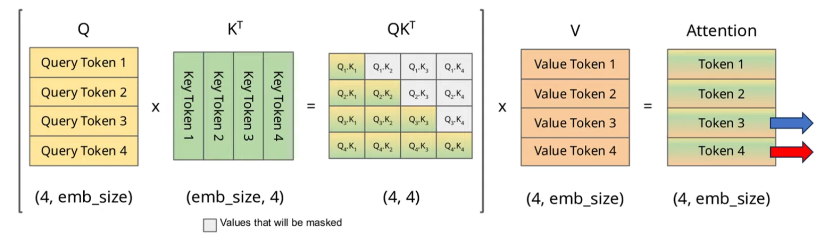 Auto-regressive LLM serving 연산에서는 보통 중복연산을 피하기 위해 KV Cache를 사용한다. 아래는 attention 구조를 나타낸 것인데, 사실 auto-regressive 구조에서는 과거의 key, value는 변하기 않기 때문에 이들을 캐싱해놓는 것이다.