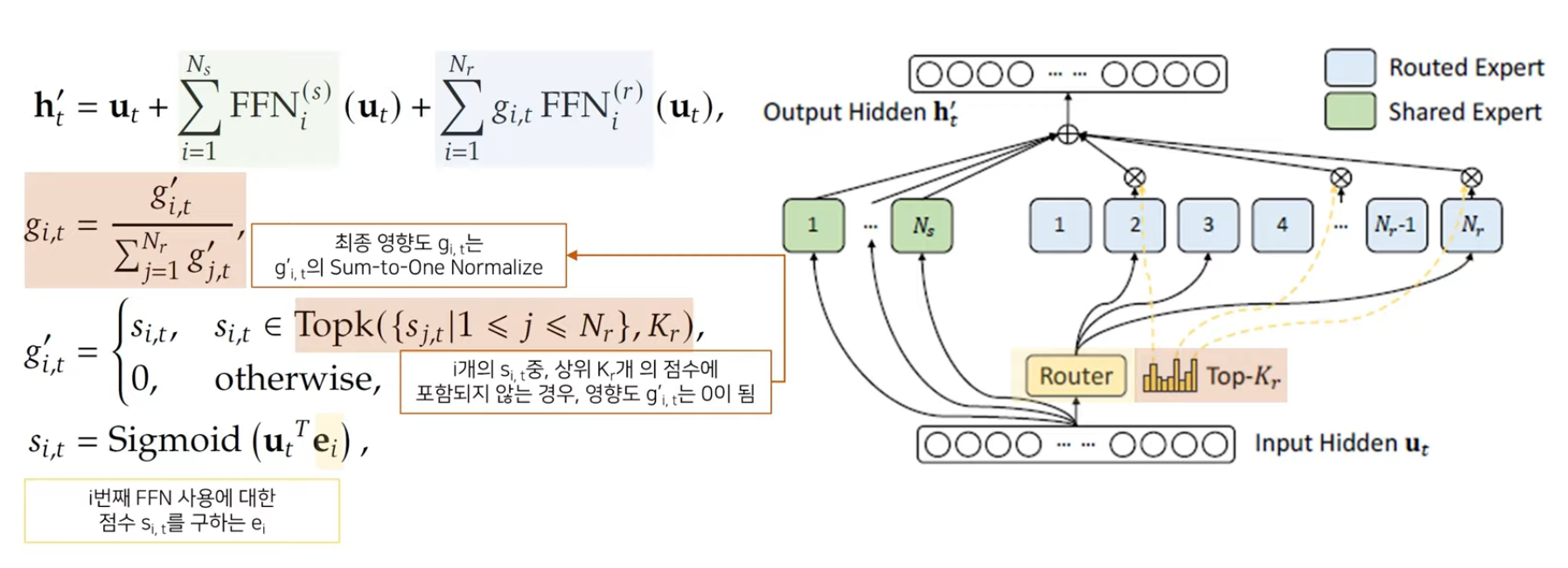 MoE 구조는 워낙 유명해서 많이 들어봤겠지만, N_s개의 FFN은 shared expert로 사용하고, 나머지 N_r 개의 FFN 중 유동적으로 topk개를 골라 activate해 사용하는 구조이다.