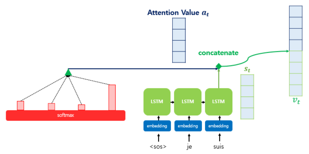 이렇게 나온 Attention Value와 디코더의 현재 은닉상태를 concat하여 하나의 벡터로 만들고, 이를 신경망에 넣은 결과를 디코더의 input으로 활용한다! 그럼 이전의 정보를 잘 활용할 수 있기 때문에 더 잘 예측할 수 있다 ~_~