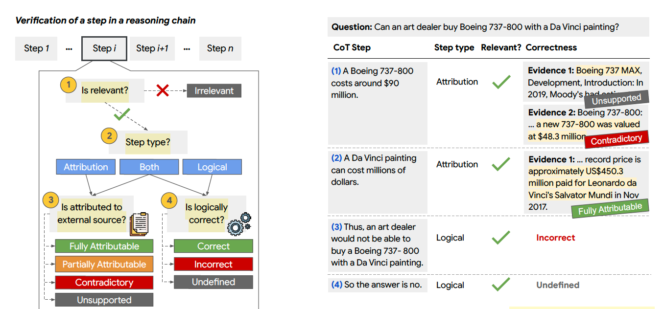 - 각 step은 먼저 final answer와의 relevance로 labeled 된 다음, attribution step (factual knowledge 관련) /logical step (previous step과 logical한 inference 관계를 이루는가)으로 나눔.