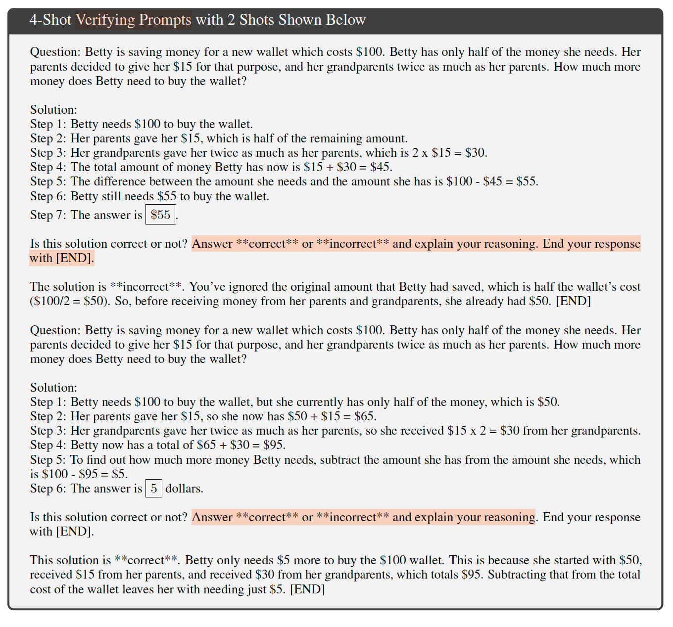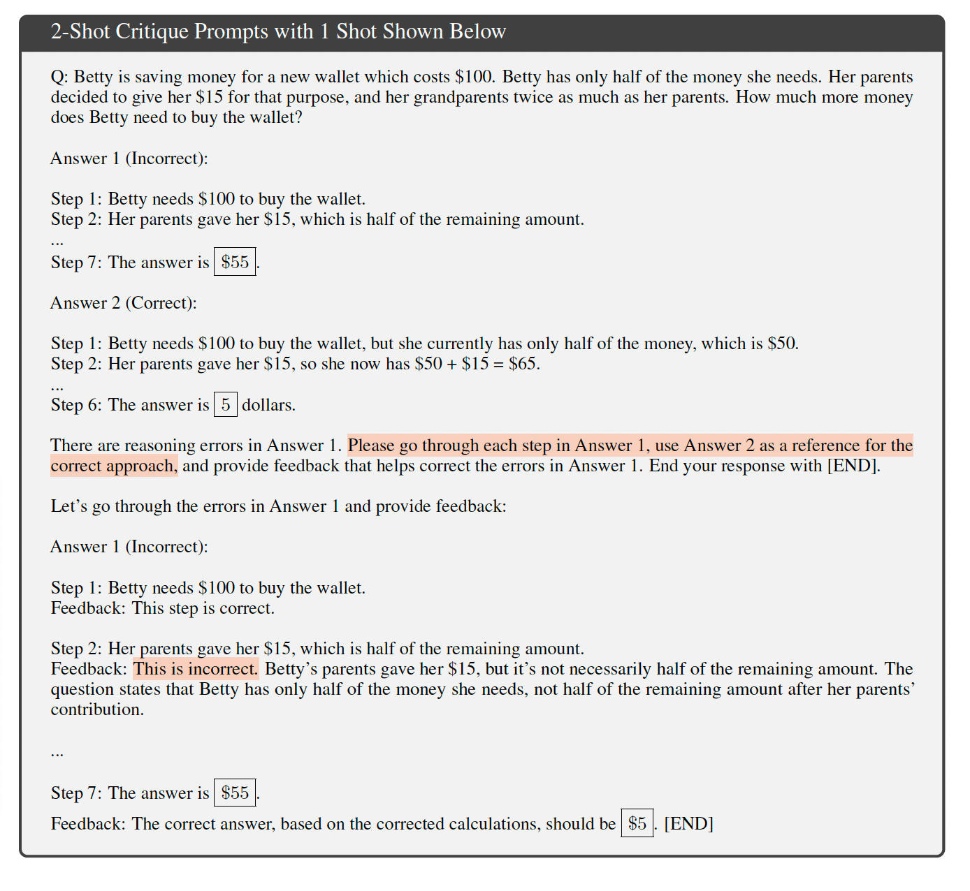 - Correct solution을 힌트 삼아 critique을 생성함 (few-shot critique prompt 존재)