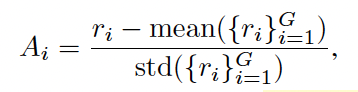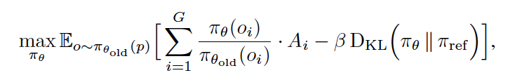 - GRPO는 그룹 내 better answer가 나오기를 encourage한다. Final training objective는 아래와 같음.