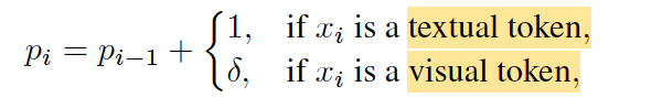 - 이렇게 하는 대신 visual token index을 1보다 작은 값으로 촘촘히 증가시킨다. (position index computation에 modality-specific reculsive function을 이용한다). 이를 통해 비주얼 토큰들을 작은 구간 안에 촘촘히 배치할 수 있고, 위치 공간이 덜 낭비된다.