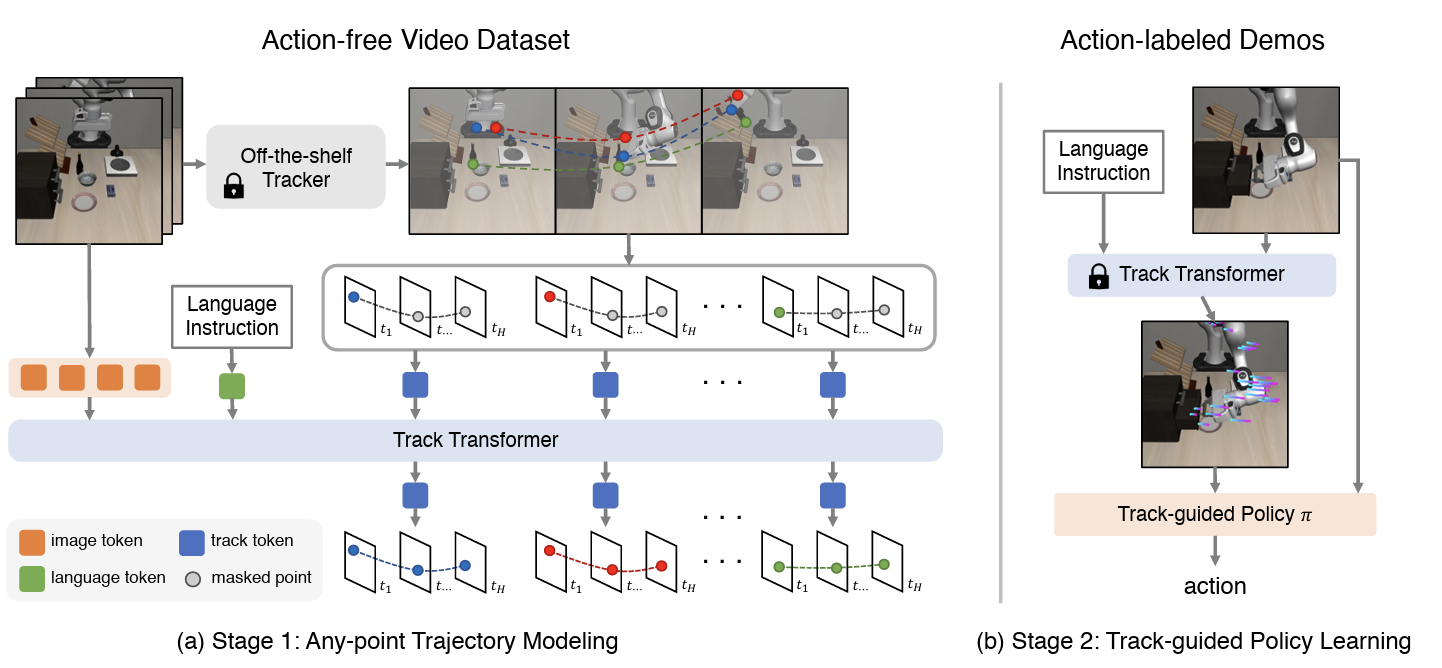 - 인터넷/휴먼/로봇 action-free 비디오에서 trajectory 예측 모델(Track Transformer)을 학습.
