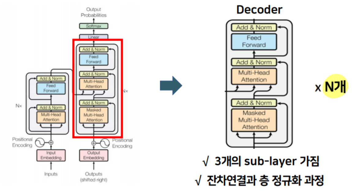 기본적으로는 Encoder와 동일한 Multi-head attention, FF 구조임