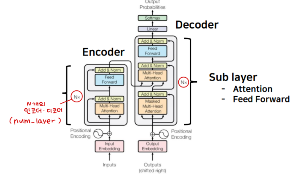 인코더층과 디코더층은 여러겹 적재할 수 있는데 그 개수는 num_layer 하이퍼파라미터로 결정됨!