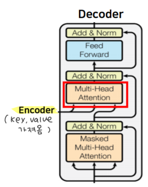 - Query는 디코더 행렬, Key와 Value는 인코더 행렬에서 받는다