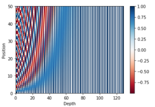 이렇게 도출된 포지셔널 인코딩 행렬을 시각화한 그림은 다음과 같다 (50X128 크기)