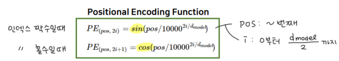 Positional Encoding에 쓰이는 함수는 다음과 같음