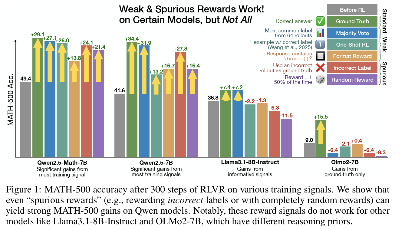 TL;DR 이상한 reward (random reward)를 주고 GRPO post-training을 해도 Qwen 계열 모델에서는 성능이 향상된다. 다른 모델에 대해서는 적용이 안된다. 이 이유는 Qwen의 Code Reasoning 사용 때문이다.