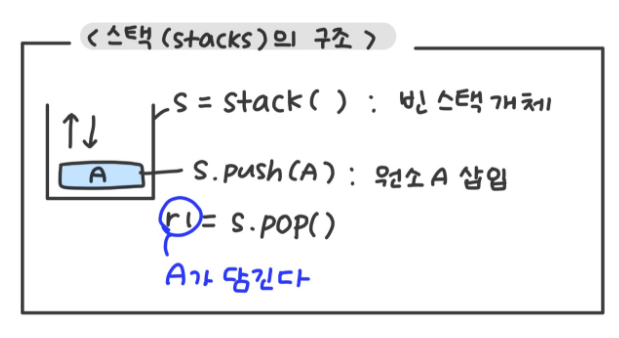 기본적으로 스택은 넣을 때는 한쪽 끝에서 밀어넣어야 하고(push), 꺼낼 때에는 같은 쪽에서 뽑아 꺼내야한다.(pop) 간단히 그림으로 나타내면 다음과 같다.