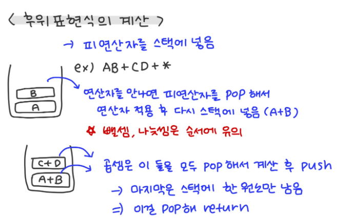 그리고 이 후위표현식을 연산할 때는 피연산자일 때 스택에 push하고, 연산자를 만나면 스택에서 피연산자를 pop해 연산하여 스택에 push하면 된다.
