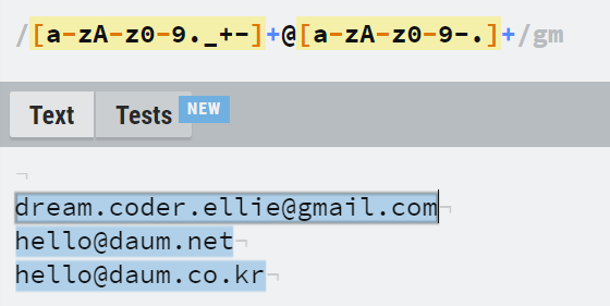 모든 문자를 선택할 때는 \w가 아니라, 그냥 대괄호 안에 [a-zA-Z0-9.+-] 이렇게 등장해도 되는 특수문자까지 한번에 넣어주면 하나라도 있으면 선택하는게 되니까!! 그렇게해보쟈!!