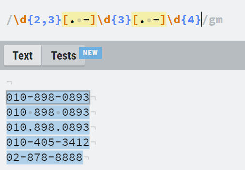 1. 가운데가 스페이스, . , -로 구분되는 전화번호 추출