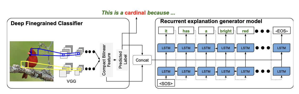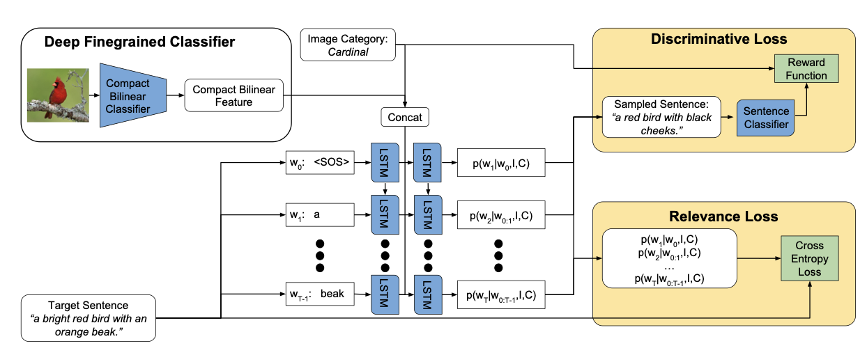 우선 전반적인 아키텍처는 fine-grained classifier 와 language generation model 이 합쳐져 있는 형태입니다. 우선 fine-grained classifier (VGG, ResNet 등) 으로 이미지에 대한 feature를 추출하고, 이를 label 과 함께 언어 생성모델에 input으로 넣습니다. 이 언어 생성모델은 LSTM 기반이므로, 당연히 이전 타임스텝 (이전 단어) 도 input으로 들어오게 되겠죠? 따라서 이런식으로 이미지에 대한 설명을 생성하는 것이 이 아키텍처의 목적입니다.