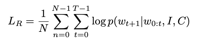 여기서 각각 I는 image features, C는 category prediction, N은 batch size를 나타냅니다. 그리고 w_t 는 ground truth word를 나타냅니다. 논문에서는 이 loss 함수가 ground truth의 log likelihood 함수의 역할을 한다고 말합니다.