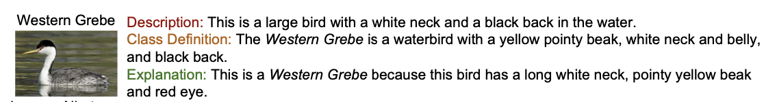 하지만 이러한 설명은 단순히 이미지에서 보이는 새의 특성을 묘사한 것이지, 'Western Grebe' 라는 class만의 구별되는 특성이라고 말할 수 없을 수도 있습니다. 예를 들어 하얀색 목을 가진 새는 'Western Grebe' 라는 새에 국한되지 않을 수도 있으니까요. 따라서 우리가 이미지를 묘사하는 설명은 Image에 대해 relevance는 높지만, 정작 class 에는 relevance가 낮을 수도 있습니다. 그 특성이 특히 "흔한" 요소이면 말이죠. 이러한 설명은 당연히 classification에는 도움이 되지 않는 정보일 확률이 높겠죠?