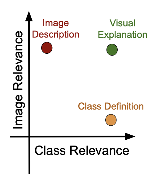 따라서 저자는 우선 Image에 대한 description과 class에 대한 definition을 구분합니다. 그리고 진정한 Visual Explanation이란 이 두가지의 특성을 모두 지닌 explanation이어야 한다고 역설합니다. 다음 그림을 보시죠.