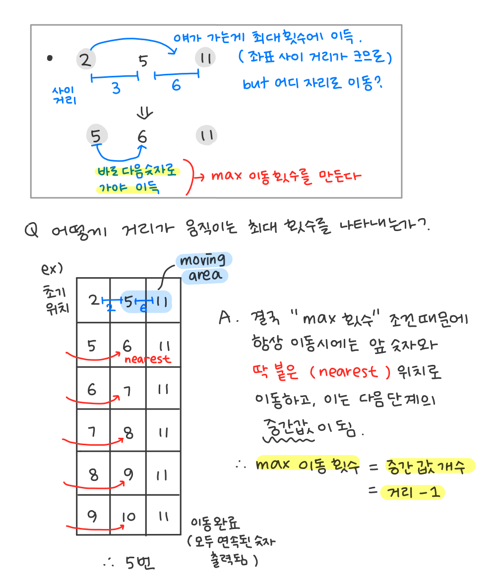 1. 초기 위치 A, B, C 중에서 바깥 A, C 중 이동해야할 element를 정할 때는 A&B와 B&C 사이의 거리의 대소를 정해야한다.