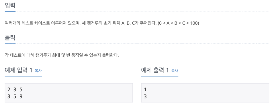 한 번 움직일 때, 바깥쪽의 두 캥거루 중 한 마리가 다른 두 캥거루 사이의 정수 좌표로 점프한다.