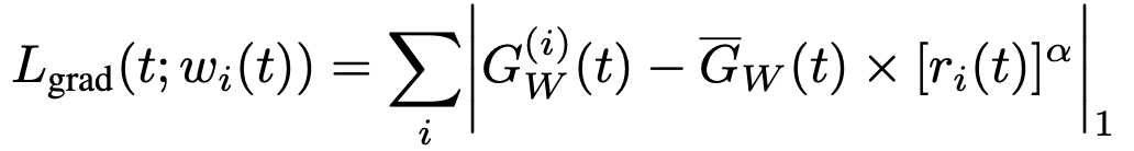 수식을 자세히 들여다보면 저희가 앞서 정의한 notation이 숨어있음을 알 수 있습니다. 기본적으로 MAE loss (L1 loss)이며, 아래와 같은 목표를 가진 loss라고 할 수 있습니다. 이를 해석해보면 아마 앞서 정의한 task별 gradient $G_w^{(i)}(t)$를 모든 task의 gradient의 average 값(즉, common training scale)과 inverse training rate를 곱한 값에 가까이 만들고 싶어하는 듯 합니다.