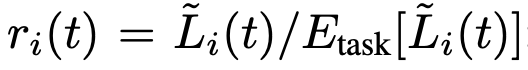 - $\tilde{L}_i(t)$ : 특정 training time $t$와 task $i$에서의 loss ratio 입니다. 이는 task $i$의 inverse training rate가 되며, training이 빠를 수록 이 값은 낮은 값을 갖게 됩니다. 역시 수식은 다음과 같습니다.