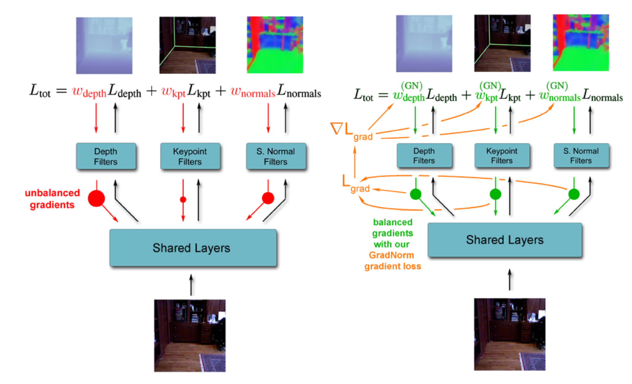 따라서 여기서 우리는 GradNorm을 통해 각 task loss의 weight인 $w_i(t)$의 function을 학습하는 것을 목표로 합니다. 이를 통해 우리의 목표인 서로 다른 task들의 학습을 similar rate로 조절할 수 있습니다. 아래 그림을 보시면 우측이 GN 적용 후이며, weight를 GradNorm Loss를 통해 학습하고 있음을 알 수 있습니다.