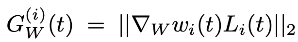 - $G_w^{(i)}(t)$ : 가중치가 매겨진 Singletask Loss $w_i(t)L_i(t)$의 gradient의 L2 norm 입니다. 수식은 다음과 같을 것입니다.