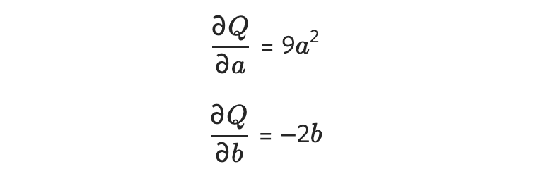 예를 들어 $a$와 $b$를 weight(매개변수, 파라미터) 로 갖는 NN에서 loss를 $Q = 3a^3 - b^2$ 라고 가정해봅시다. 여기서 gradient descent 과정을 구현하기 위해서는 다음과 같은 매개변수에 대한 미분값을 구해야 하는 상황일 것입니다.