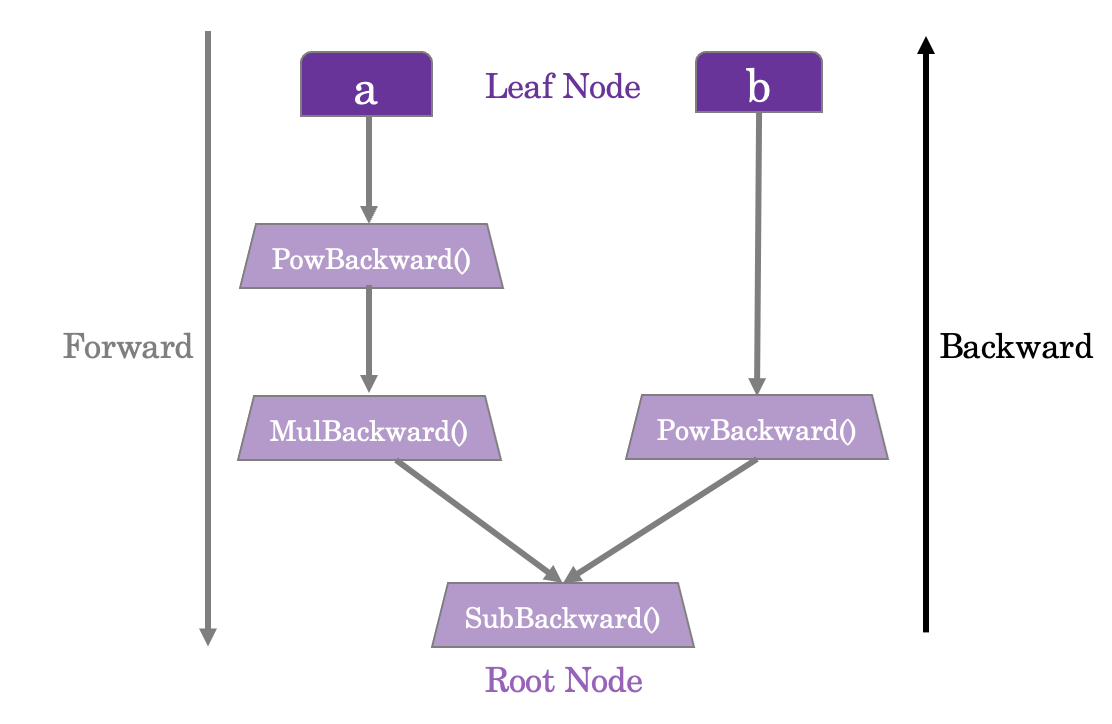 여기서 DAG의 잎(leave)은 input이고, 뿌리(root)는 output 텐서라고 생각하시면 됩니다. 그리고 이 그래프를 뿌리부터 잎까지 추적하며 chain rule을 적용하면 gradient descent 과정이라고 할 수 있겠죠.