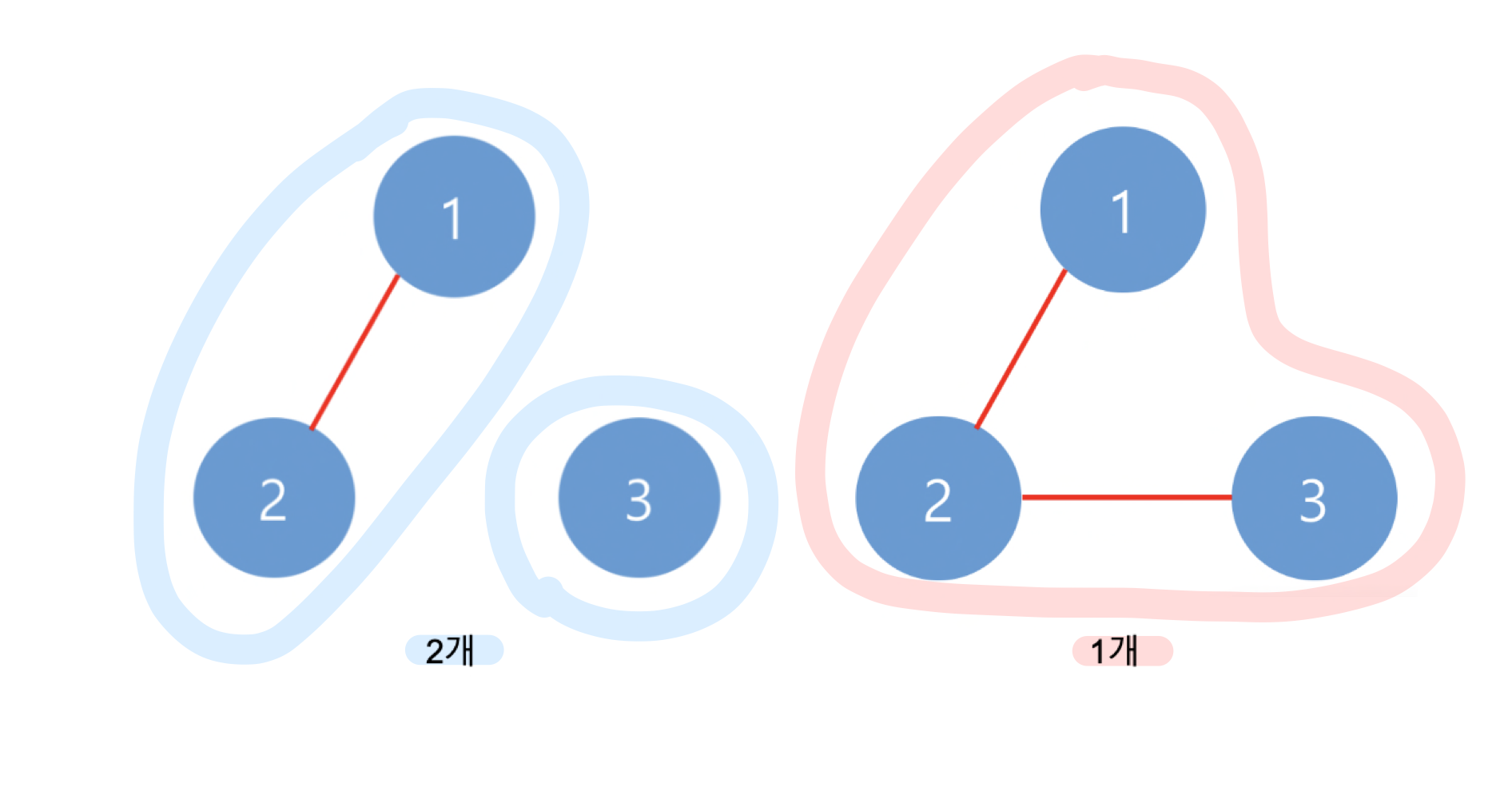 바이러스 문제는 우선 1로부터 edge로 이어진 모든 노드의 개수를 반환하는 문제였다. 하지만 내가 파악한 이번 네트워크 문제는 이어져 있는 "뭉탱이"의 개수를 세는 것이다. 따라서 다른 점이 있어서 바이러스 문제의 코드베이스로는 풀기 어려운 문제였다.