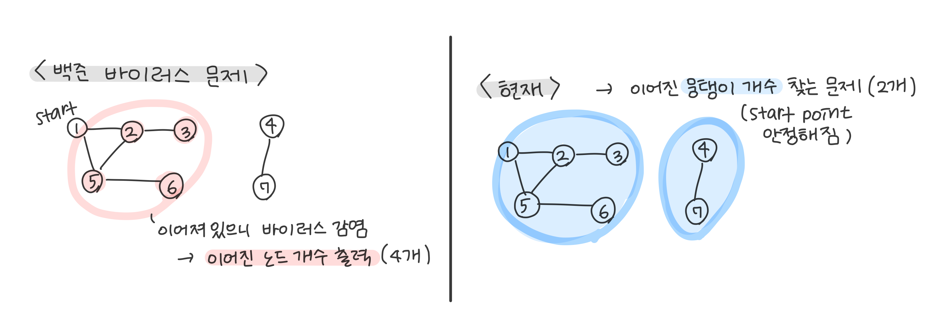 이 문제는 개인적으로 백준 # 2606번 바이러스 문제와 비슷하다는 생각이 가장 먼저 들었다. 그래서 비슷하게 DFS로 접근해야겠다는 생각을 가장 먼저 했던 것 같다. 하지만 문제 파악 후 바이러스 문제와는 살짝 다른 점이 있는데, 이는 다음과 같았다.