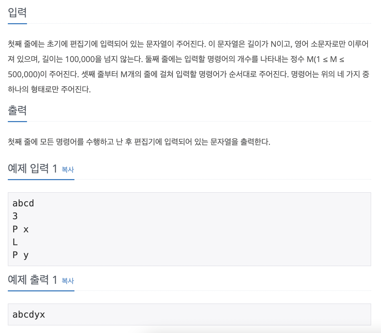 따라서 이 문제의 핵심 아이디어는 커서의 위치를 기준으로 데이터를 두개의 스택으로 나누는 것이다! 처음에는 하나의 스택에 데이터를 모두 몰아넣는다. 그리고 앞서 언급한 pop과 append의 스택 연산을 이용해 상황에 맞게 원소를 넣고 빼는 것이다.